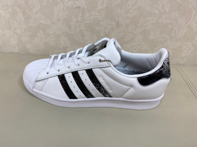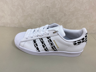 3ストライプとヒールパッチのところにトレンド感のあるアニマル柄がプリントされています。他のSUPERSTARと違い、シューレースが幅広で女の子らしいデザインとなっております。